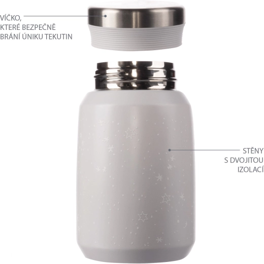 Wysokiej jakości termos na jedzenie i przeciery o pojemności 500 ml utrzymuje gorące potrawy do 12 godzin, a zimne do 24 godzin. Wykonany jest z wysokiej jakości stali nierdzewnej odpornej na korozję. Szczelna pokrywka zapobiega przeciekaniu. Dzięki izolacji próżniowej termos wypełniony gorącą zawartością nie nagrzewa się z zewnątrz.