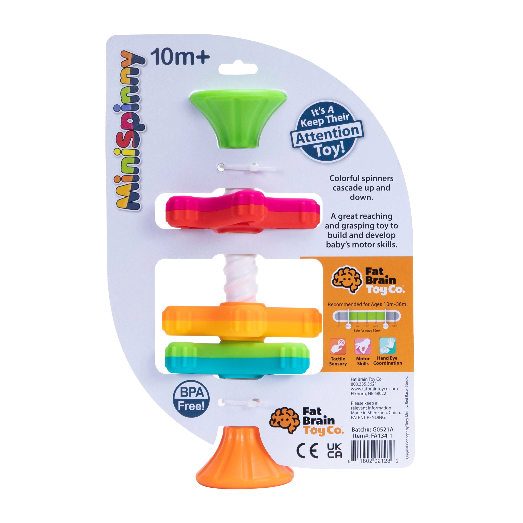 Dzięki przyssawce łatwo przymocujesz zabawkę do stołu, tacki krzesełka czy okna – nic się nie zgubi, a elementy trzymają się razem. MiniSpinny świetnie sprawdzi się w domu, w podróży i w łazience. Bezpieczny plastik bez BPA i ftalanów zapewnia beztroską zabawę.