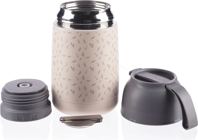 W zestawie znajduje się sprytna składana łyżeczka, która idealnie mieści się w zamknięciu, dzięki czemu możesz zafundować dziecku ciepłą kaszkę lub zupę gdziekolwiek. Pokrywkę termosu można używać jako kubek lub miseczkę. Górne zamknięcie wyposażone jest w zawór bezpieczeństwa, który uwalnia nadmiar powietrza tworzącego ciśnienie. Dzięki zwolnieniu sprężonego powietrza pojemnik można łatwo otworzyć i uniknąć ewentualnego poparzenia parą.