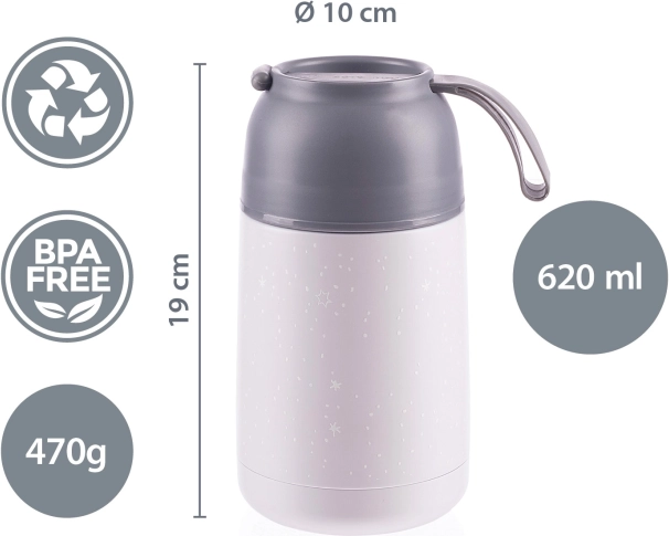 Wysokiej jakości termos na płyny o pojemności 620 ml utrzymuje gorące napoje do 12 godzin, a zimne do 24 godzin. Wykonany jest z wysokiej jakości stali nierdzewnej odpornej na korozję. Szczelna nakrętka zapewnia, że termos nie przecieka. Dzięki izolacji próżniowej termos wypełniony gorącą zawartością nie nagrzewa się z zewnątrz. Dla wygodnego chwytu termos wyposażono w silikonowy uchwyt.