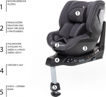 Fotelik przeszedł najbardziej wymagające testy w Holandii, spełnia normę ECE R129 i-Size i będzie odpowiedni dla dzieci od urodzenia do 105 cm wzrostu lub 18 kg. Jest w pełni obrotowy (360°), co pozwala nie tylko zmieniać kierunek podróżowania we wszystkich 4 regulowanych pozycjach, ale także zapewnia znacznie wygodniejszą obsługę dziecka przy wsiadaniu i wysiadaniu.