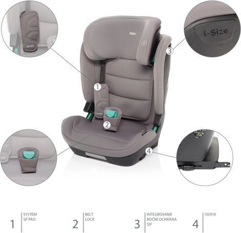 Na wypadek zderzenia czołowego fotelik wyposażono w SP PAD, który redukuje obciążenie głowy, odcinka szyjnego kręgosłupa i klatki piersiowej. Funkcja Belt Lock dodaje 4. punkt mocowania podczas zapinania i przy zderzeniu czołowym zmniejsza nacisk na brzuszek dziecka. Zintegrowana ochrona boczna SIP na całej długości chroni dziecko także w dolnej części. Spełnienie najnowszej normy i-Size gwarantuje bezpieczeństwo przez cały okres użytkowania.