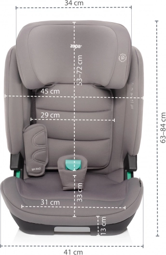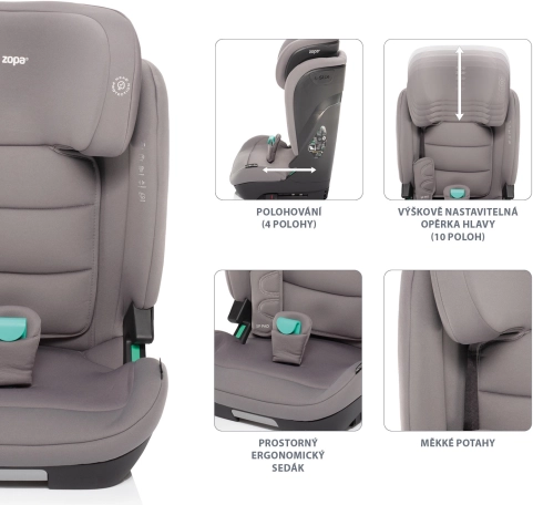 Przestronny fotelik samochodowy z miękkimi tapicerkami i możliwością odchylenia w 4 ergonomicznych pozycjach zapewnia komfortową podróż nawet podczas dłuższej jazdy i snu. Ustawienie pozycji można łatwo zmienić za pomocą blokady w przedniej części fotelika. Zagłówek oferuje aż 10 poziomów regulacji, dzięki czemu fotelik rośnie wraz z dzieckiem.