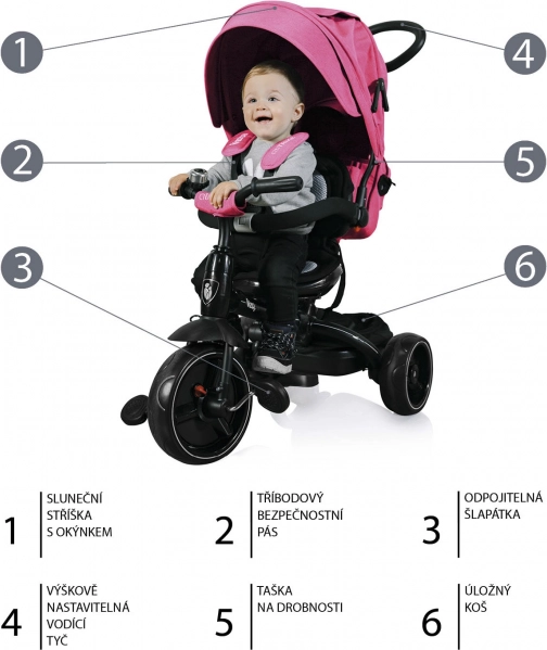 Bezpieczeństwo zapewniają pasy bezpieczeństwa i praktyczny przycisk blokady obrotu pedałów. W miarę jak dziecko rośnie, możesz stopniowo zdemontować daszek, pałąk, przednią podpórkę, pedały oraz tylne oparcie, umożliwiając pełne samodzielne prowadzenie. Praktyczny koszyk i torba pomieszczą wszystkie niezbędne rzeczy na spacer.