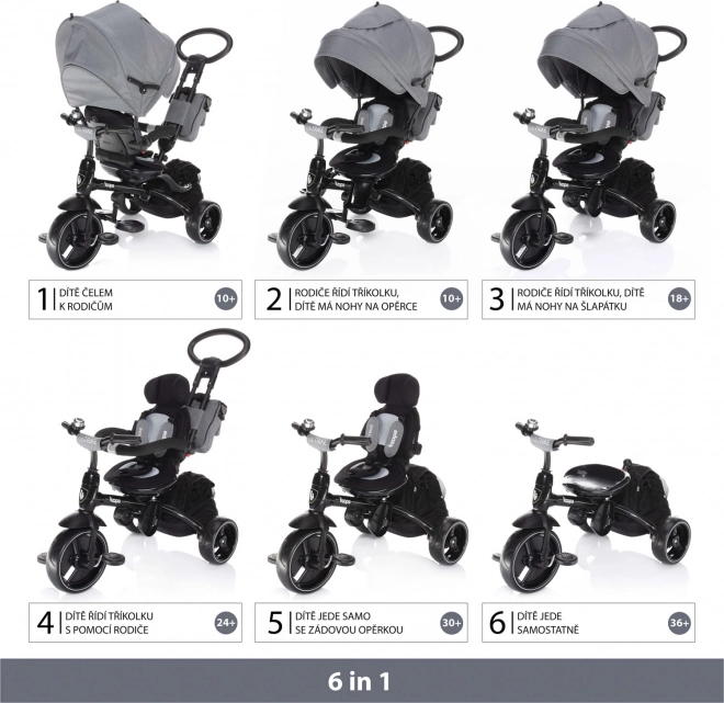 Możliwość obrócenia siedziska tyłem do kierunku jazdy, odłączenia pedałów oraz stopniowego demontażu daszka, pałąka i oparć pozwala dopasować trójkołowiec do wieku i umiejętności dziecka.