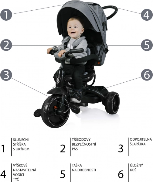 Dodatkowym atutem jest łatwy demontaż daszka, barierki i podpórek, który umożliwia dziecku maksymalną przyjemność z jazdy. Trójkołowy jest wyposażony w przestronny tylny koszyk i torbę, więc zawsze masz wystarczająco miejsca na wszystkie niezbędne rzeczy. Nowoczesny design zapewnia, że trójkołowiec zawsze przyciągnie uwagę.