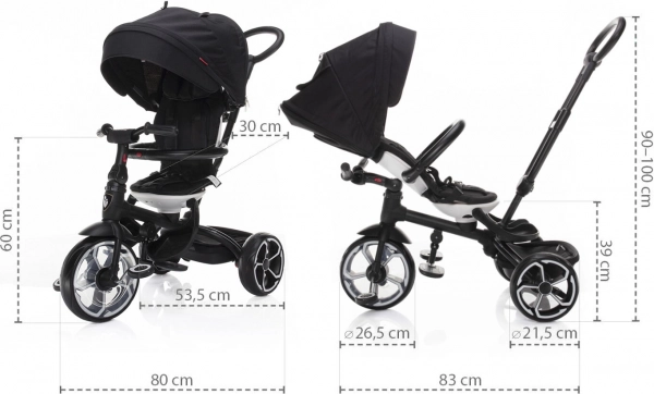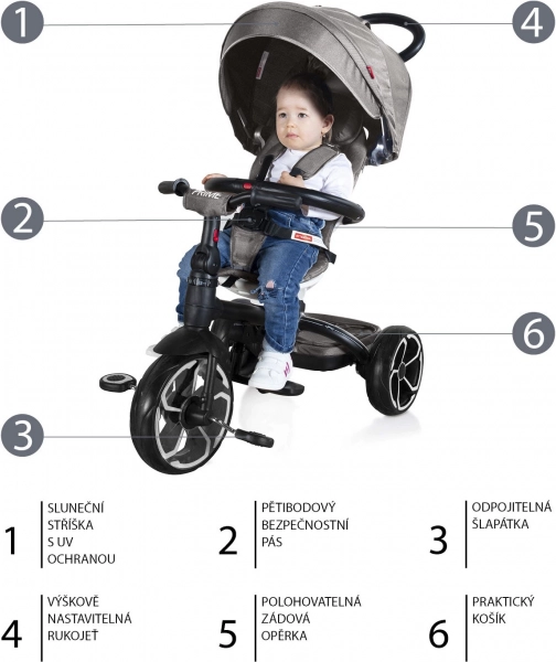 Nowoczesny trójkołowiec dla dzieci od 6 do 36 miesięcy z eleganckim sportowym designem. Wyposażony w regulowane obrotowe siedzisko, 5-punktowy pas bezpieczeństwa oraz daszek z ochroną UV dla maksymalnego komfortu i bezpieczeństwa podczas jazdy.