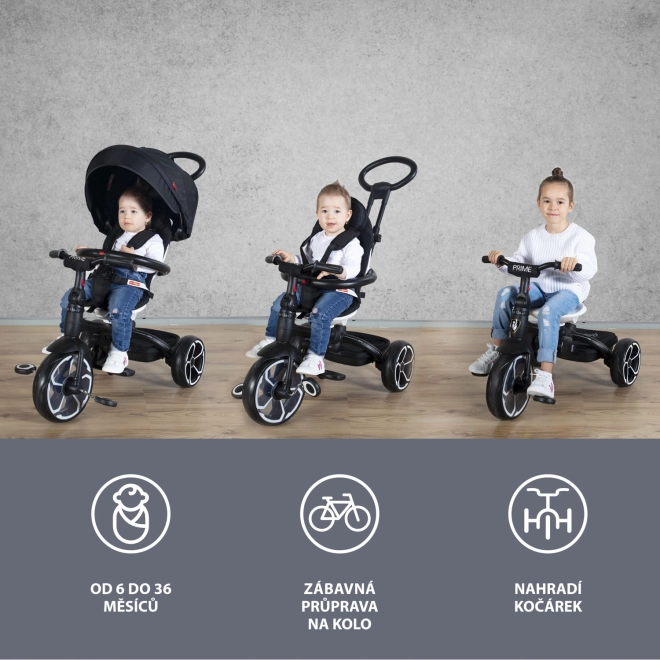 Elegancki trójkołowiec Prime dla dzieci 6-36 miesięcy z obrotowym siedziskiem i daszkiem UV. Udźwig 25 kg, 4 tryby użytkowania.