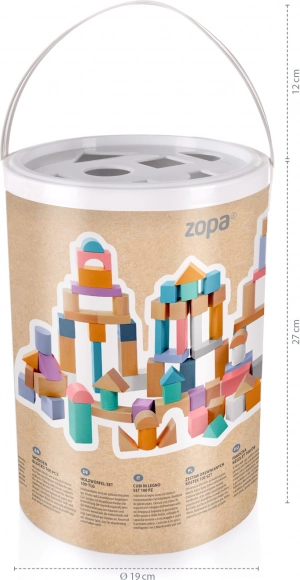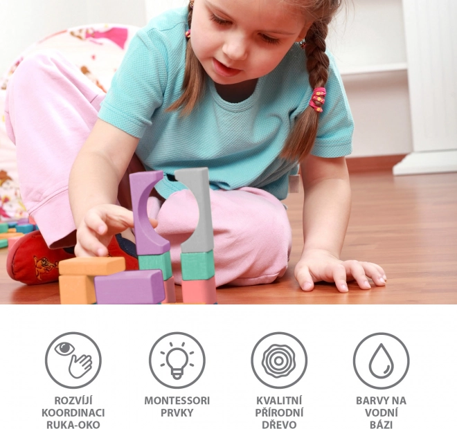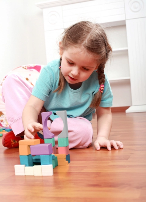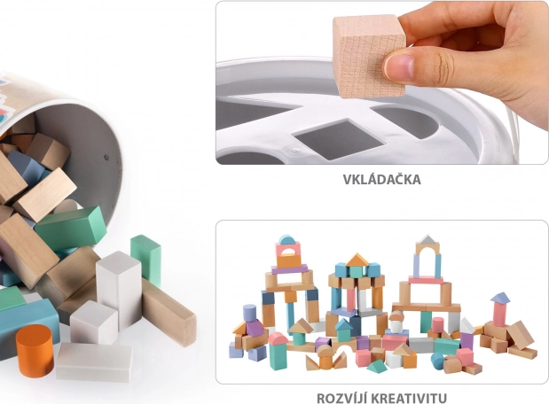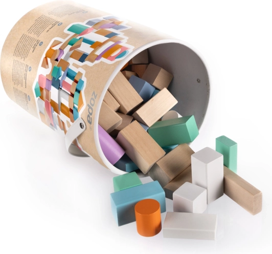 Klocki występują w różnych kształtach, w tym sześcianach, walcach i trójkątach, w pastelowych odcieniach, aby wspierać kreatywność.