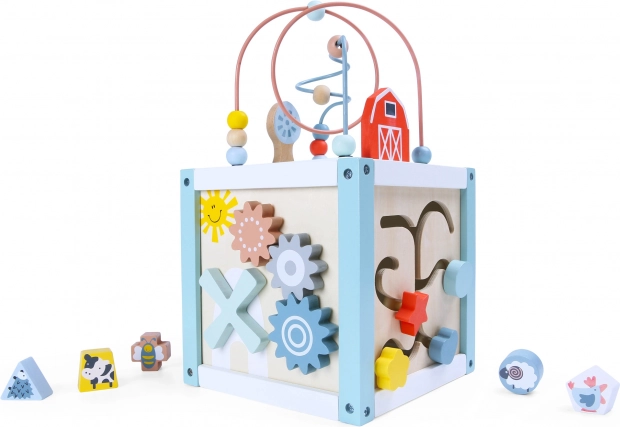 Drewniana kostka aktywności dla dzieci oferuje różnorodne możliwości zabawy. Wspiera rozwój motoryki małej i uczy dzieci kształtów, kolorów oraz liczenia.
