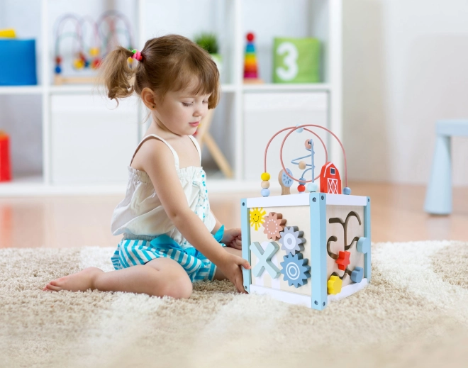 Drewniana kostka aktywności dla dzieci wspiera rozwój motoryki i naukę kształtów oraz kolorów. Idealna dla dzieci od 18 miesięcy.