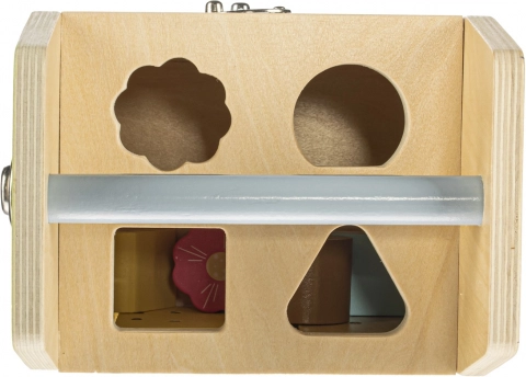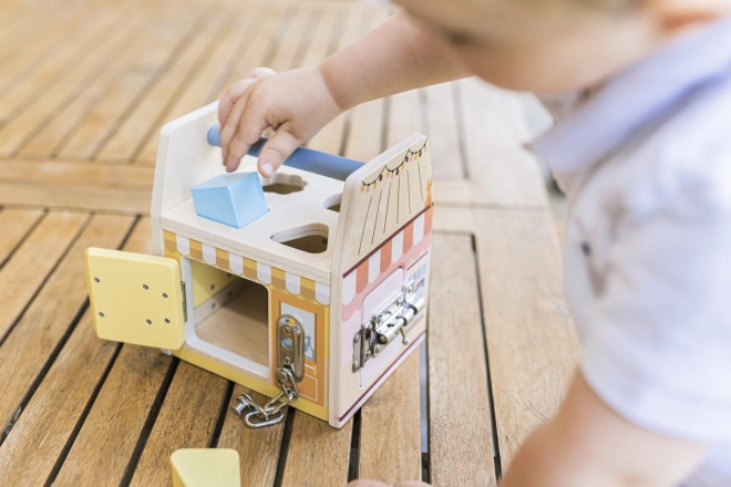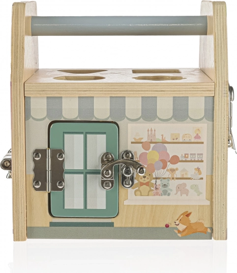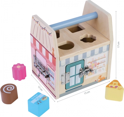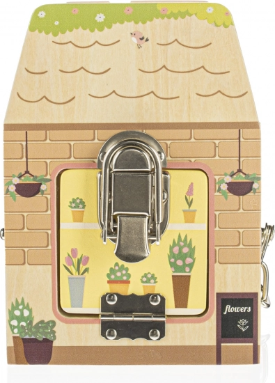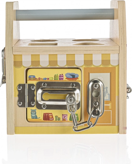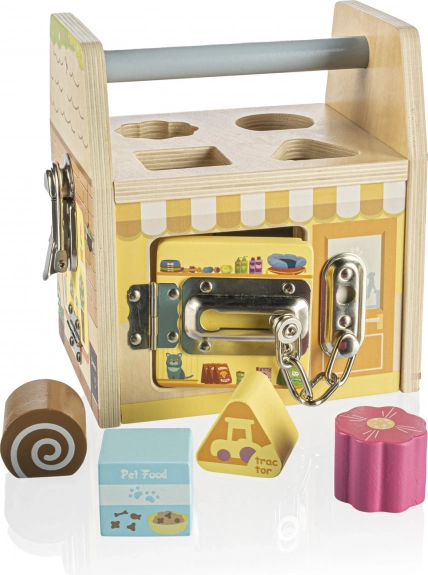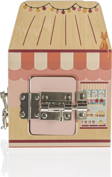 Każda strona tej drewnianej kostki przedstawia inny sklep, a każdy sklep, jak przystało, ma swój specjalny zamek chroniący przed złodziejami. Dzieci, bawiąc się zamkami, uczą się logicznego i przestrzennego postrzegania.