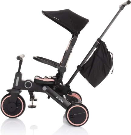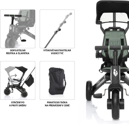 Model X Trike wyróżnia się składaną konstrukcją do bardzo kompaktowych rozmiarów, dzięki czemu łatwo mieści się w samochodzie lub szafie. Dzięki możliwości jazdy przodem i tyłem do kierunku jazdy oraz regulowanej na wysokość prowadzącej rączce poradzisz sobie z każdą wycieczką z łatwością. Praktyczna odpinana torba i torba transportowa w zestawie maksymalizują funkcjonalność.