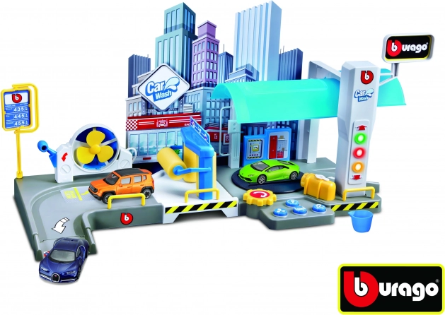 Myjnia jest wykonana z atrakcyjnie barwionych plastikowych elementów, które można łatwo złożyć i rozłożyć. Myjnia działa na 3 baterie AAA, które są dołączone do opakowania. Dzięki bateriom działają sygnalizator świetlny i przyciski, a do zbiorniczka na wodę można nalać prawdziwej wody. Myjnia zacznie działać dopiero po podłączeniu sygnalizatora do podstawy. Z myjnią Street Fire Car Wash czeka was mnóstwo zabawy.