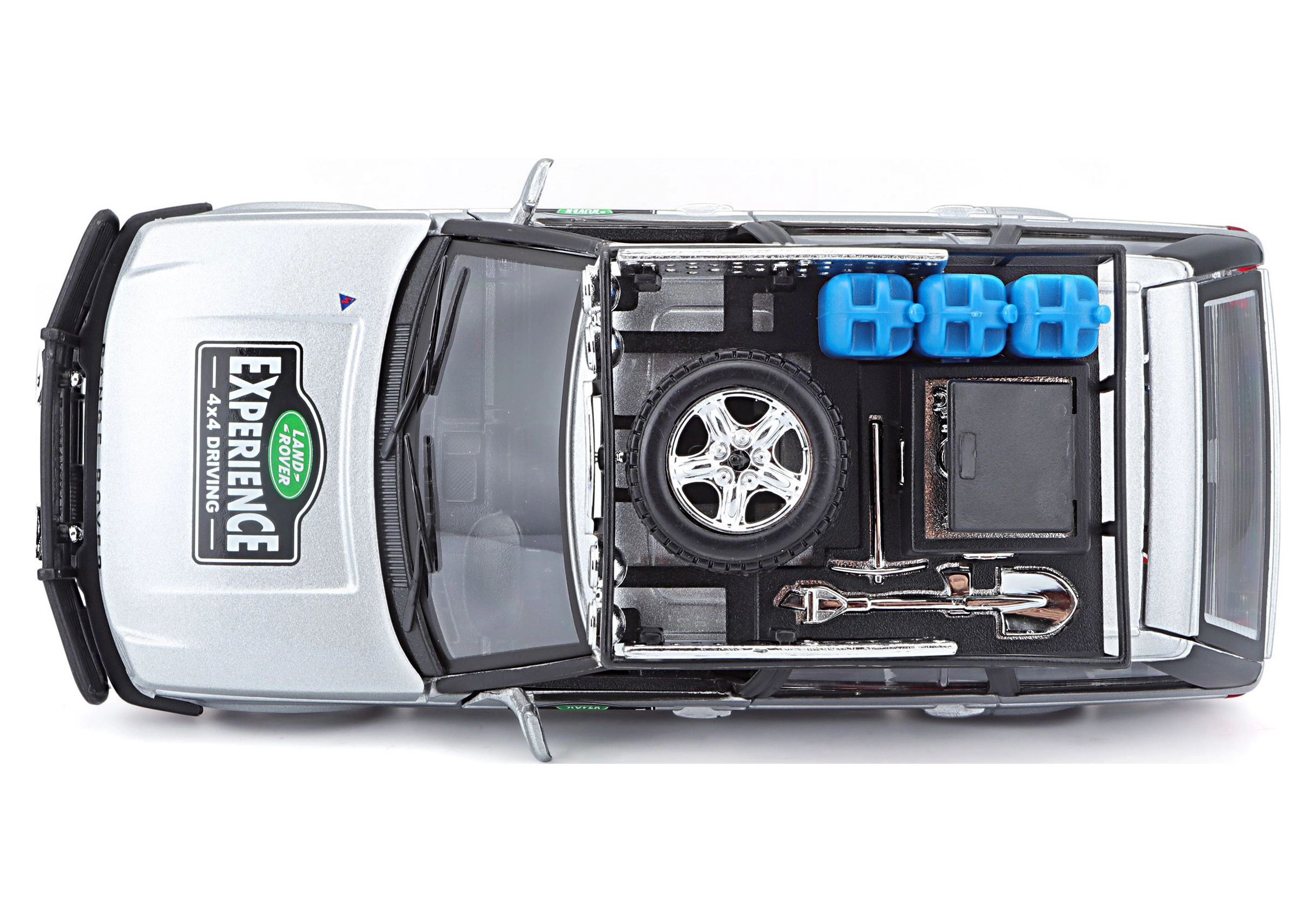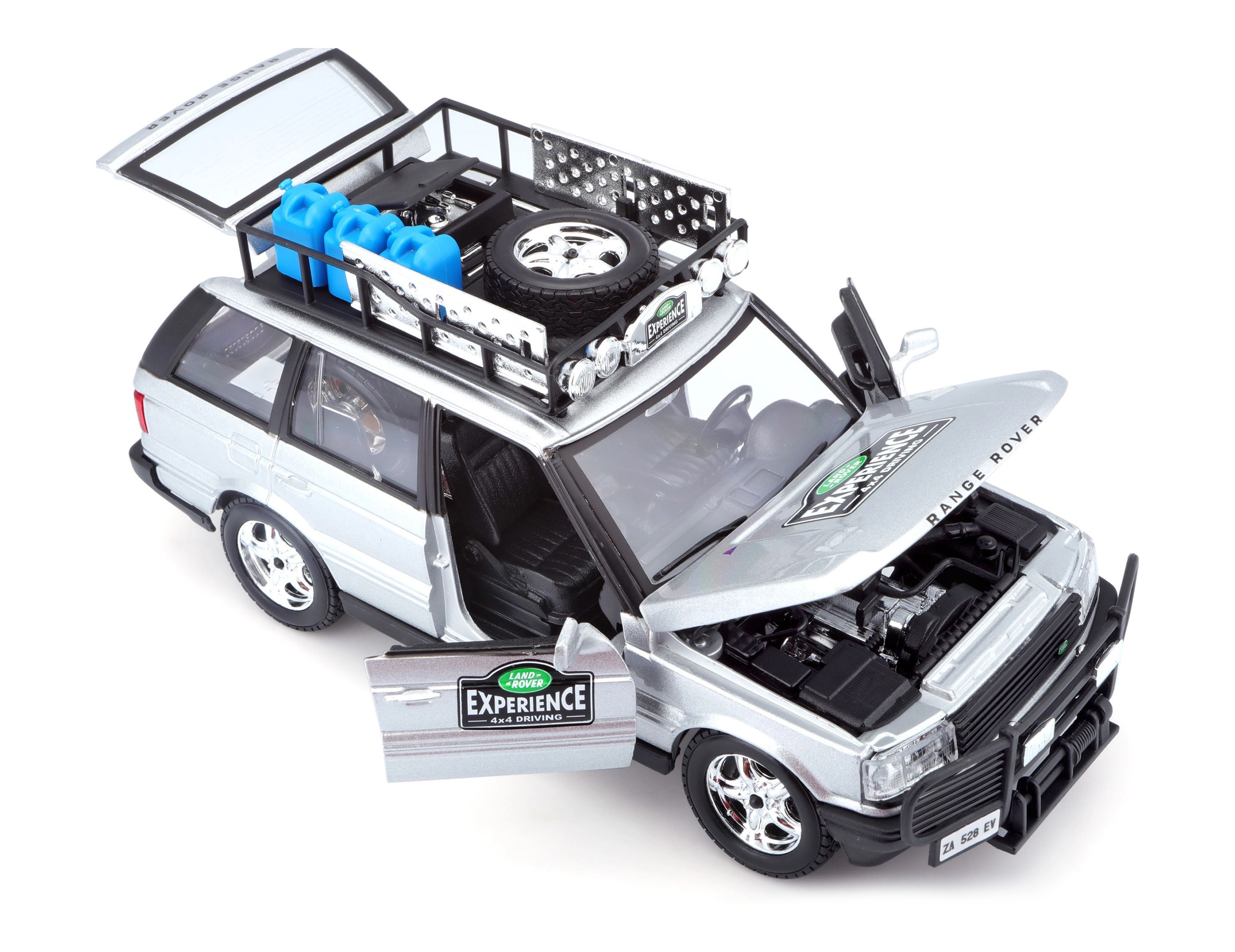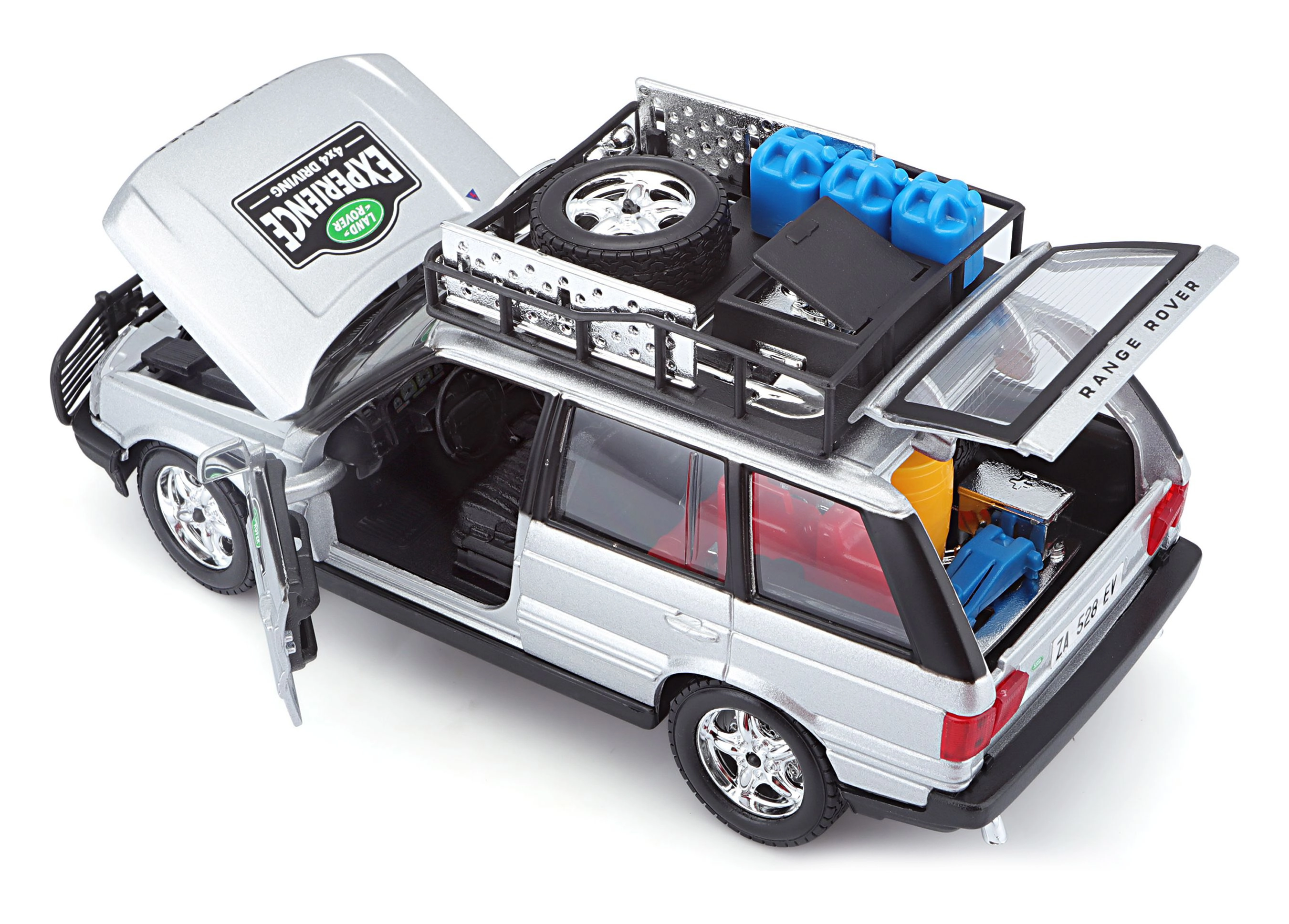 Ten precyzyjnie wykonany model RANGE ROVERA w skali 1:24 oferuje autentyczne detale, które zachwycą każdego miłośnika pojazdów terenowych. Srebrne nadwozie uzupełnione bagażnikiem dachowym z akcesoriami, przednim pałąkiem ochronnym oraz realistycznymi nadrukami tworzy atrakcyjny wygląd do zabawy i ekspozycji.