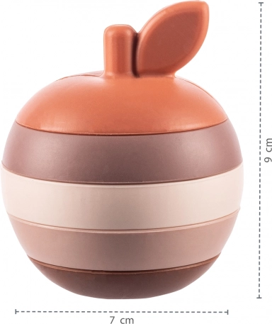 Składana zabawka w kształcie jabłka to wciągająca gra, która zajmie malucha na długo; oprócz zabawy rozwija u dziecka małą motorykę oraz koordynację ręka–oko. Zawiera 5 części, które układają się w kształt jabłka. Doskonała zabawa na pikniku na zewnątrz, w wannie lub w domu na macie do zabawy; pomaga dziecku uczyć się kształtów, kolorów, orientacji w przestrzeni, liczenia oraz umiejętności logicznych i motorycznych. Służy także jako gryzak, który stymuluje dziąsła obciążone wyrzynaniem się pierwszych ząbków.