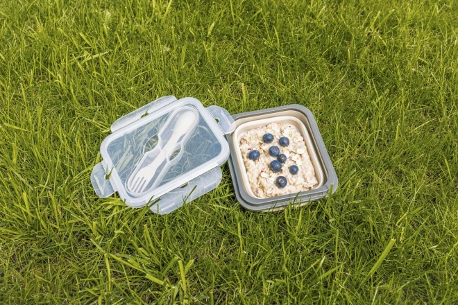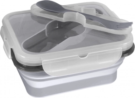 To pudełko śniadaniowe jest wykonane z bezpiecznego silikonu przeznaczonego do kontaktu z żywnością, który jest nietoksyczny i odporny na stłuczenia. Jego dużą zaletą jest łatwe składanie, dzięki któremu zmniejsza swój rozmiar nawet o 60%, co czyni je idealnym towarzyszem wycieczek. Pokrywka bardzo dobrze uszczelnia, posiada wbudowaną przegródkę na sztućce, a łyżeczka z widelczykiem są dołączone w praktycznym etui.