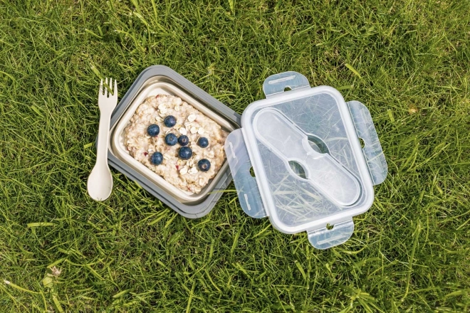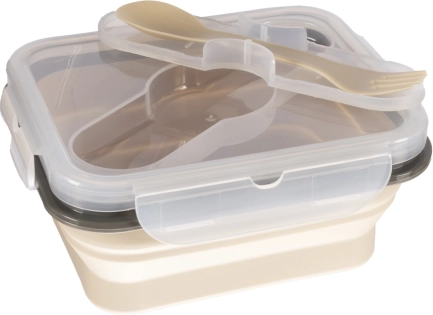 To pudełko śniadaniowe wykonano z bezpiecznego silikonu spożywczego, który jest nietoksyczny i odporny na stłuczenie. Jego dużą zaletą jest łatwe składanie, dzięki któremu zmniejsza swoje wymiary nawet o 60%, co czyni je idealnym towarzyszem na wycieczki. Pokrywka bardzo dobrze uszczelnia, ma wbudowaną przegródkę na sztućce, a łyżeczka z widelczykiem są częścią zestawu w praktycznym etui.
