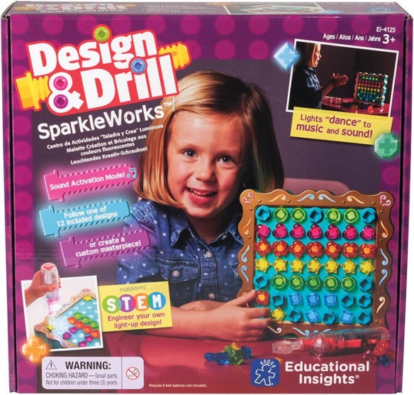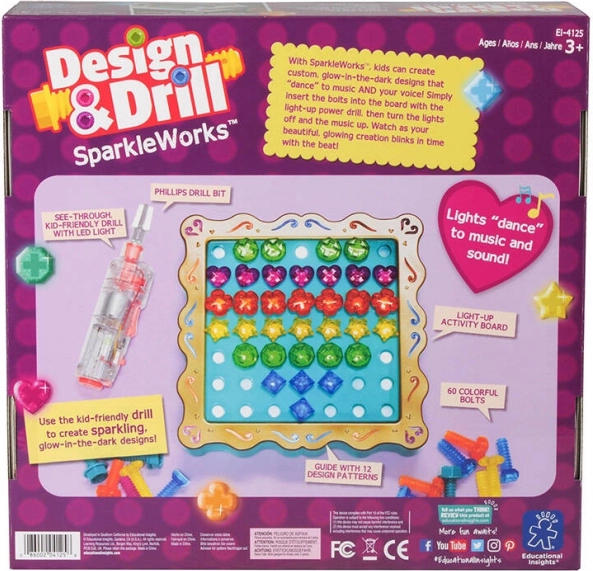 Design & Drill SparkleWorks to wyjątkowy zestaw dla małych twórców. Produkt pozwala dzieciom tworzyć świecące i migające w rytm wzory z pomocą wysokiej jakości zabawkowej wiertarki ze światłem. Zainspiruj się dołączonymi szablonami lub wymyśl własne!