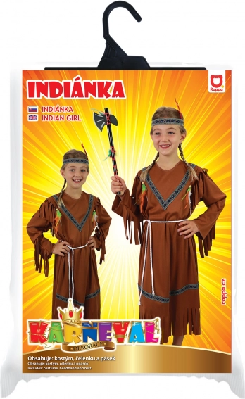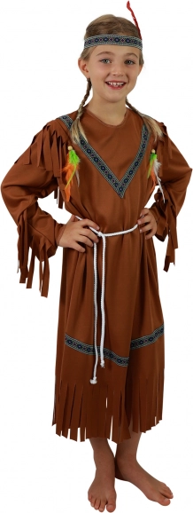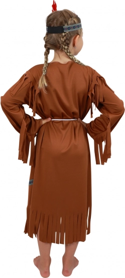 Uroczy karnawałowy kostium indianki dla dziewczynek w wieku 4–6 lat (105–116 cm). Brązowa sukienka z indiańskimi wzorami, frędzlami i dopasowaną opaską z piórami stworzy autentyczny wygląd na bal przebierańców, szkolną akademię i dziecięce zabawy. W zestawie znajduje się również sznurek jako pasek. Topór nie wchodzi w skład zestawu.
