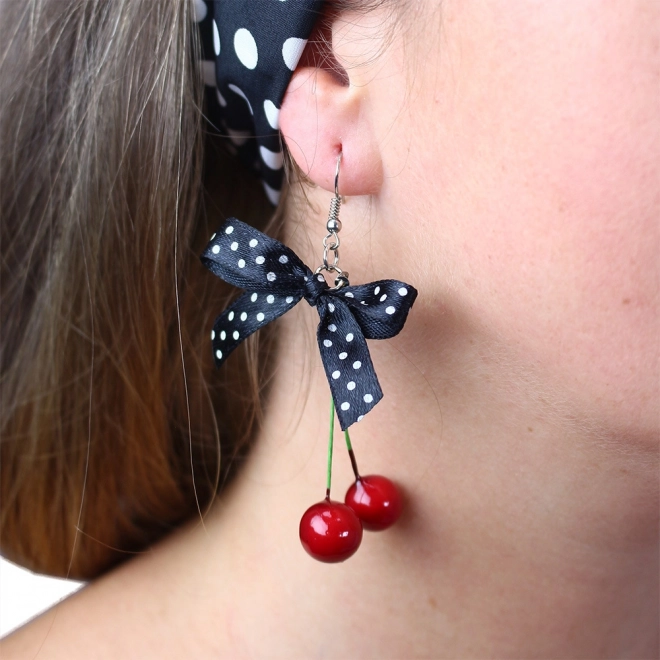 Kolczyki w kształcie wiśni z czarną wstążką w kropki wprowadzają do twojego stylu oryginalny i zabawny element.