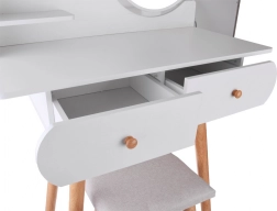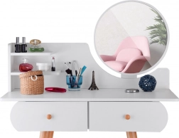 Toaletka wyposażona w dwie pojemne szuflady, okrągłe lustro, duży blat oraz miękki stołek obity jasnobeżowym materiałem spodoba się niemal każdej dziewczynce. Mebel jest na tyle duży, że będzie służył przez długie lata. Pojemne szuflady z łatwością pomieszczą biżuterię, kosmetyki, spinki, gumki do włosów itp. Większość małych dziewczynek lubi naśladować swoje mamy, babcie, siostry, a dzięki tak profesjonalnej toaletce mała elegantka poczuje się wyjątkowo.