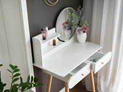 Styl skandynawski, który projektanci pokochali już lata temu, doskonale pasuje do każdego minimalistycznego wnętrza. Współczesne domy coraz częściej sięgają po ten rodzaj mebli, doceniając ich minimalistyczny charakter i neutralne barwy. Dlatego ta toaletka idealnie wpisuje się w ten klimat. Jej prosty design i jasne kolory pozwolą wkomponować ją w każde pomieszczenie. Mebel wykonany jest wyłącznie z płyty MDF. Mebel do samodzielnego montażu, dostarczany z szczegółową, obrazkową instrukcją.