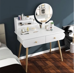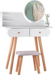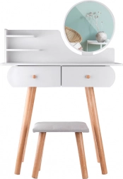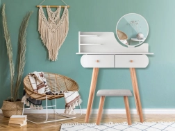 Funkcjonalna, minimalistyczna toaletka w stylu skandynawskim może stać się świetnym dodatkiem do pokoju dziewczęcego. Biała toaletka z okrągłym lustrem, pojemnymi szufladami i wygodnym stołkiem będzie idealna do nakładania makijażu, czesania włosów, poprawiania stroju, a nawet pisania pamiętnika.