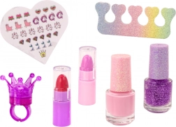 2× lakier do paznokci, naklejki na paznokcie, separator do palców, pędzelek, 2× mini pomadka, pierścionek z balsamem (korona)