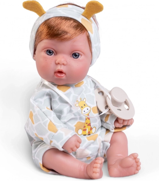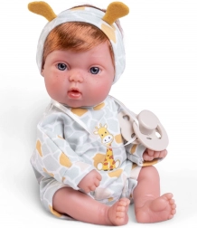 Lalka jest ubrana w uroczy strój żyrafy, uzupełniony opaską z małymi żółtymi uszkami i smoczkiem, co dodaje jej realistycznego wyglądu.