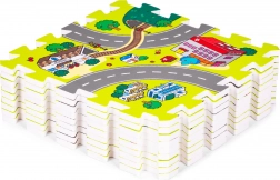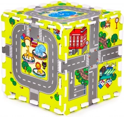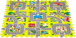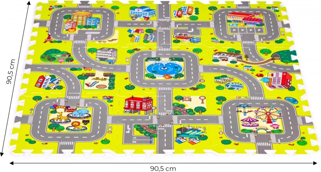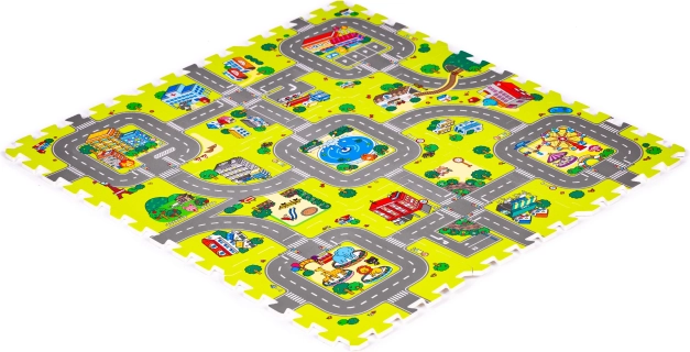 Kolorowy nadruk z drogami, budynkami i parkami pobudza wyobraźnię. Dzieci ćwiczą małą i dużą motorykę, a bawiąc się autkami, uczą się orientacji w przestrzeni.