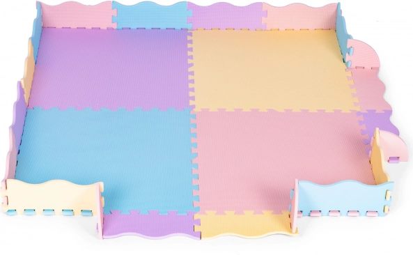 W zestawie znajdują się kwadratowe elementy i listwy brzegowe, z których łatwo złożysz dużą matę 141,5 × 141,5 cm albo podniesione krawędzie tworzące praktyczny kojec/suchy basen (ok. 119 × 119 cm). Mata nadaje się na każdy rodzaj podłogi, jest łatwa do czyszczenia wilgotną ściereczką i odporna na codzienne użytkowanie.