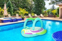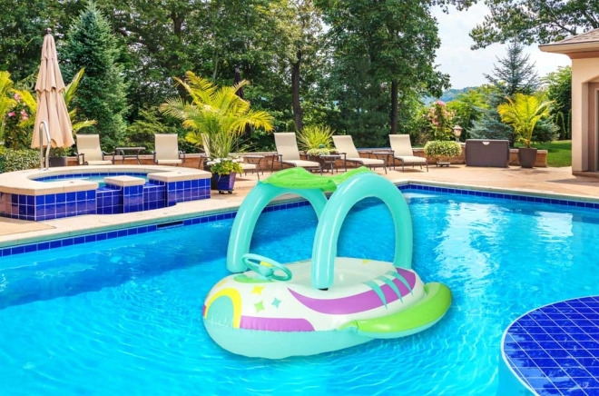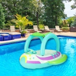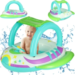 Praktyczny daszek chroni przed słońcem i pozwala na dłuższą, bezpieczniejszą zabawę w wodzie bez przegrzewania.