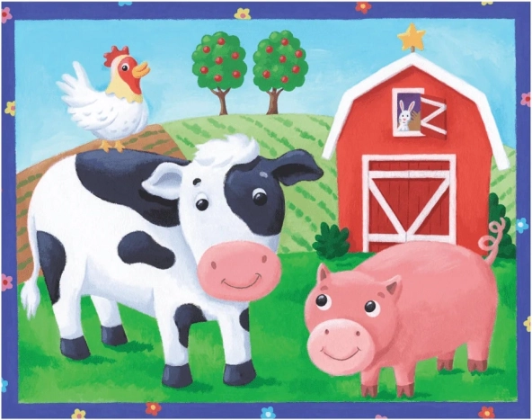 Odkryj świat zwierząt na farmie – krówka, prosiaczek i kogut ucieszą małych konstruktorów, a z czerwonej stodoły zagląda króliczek. Tło z pagórkiem i jabłoniami pobudza wyobraźnię i zachęca do opowiadania historii. Puzzle zaprojektowano z myślą o małych rączkach, elementy są ekstra grube i łatwe do układania.