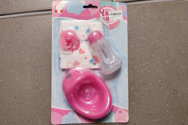 Ten zestaw akcesoriów dla lalek zawiera nocnik, butelkę, smoczek i pieluszkę, idealny dla każdej młodej opiekunki od 3 lat.
