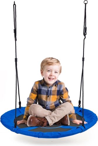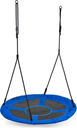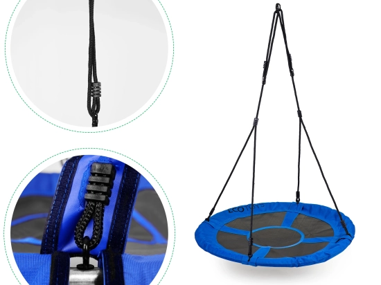 - Elementy bezpieczeństwa: Siedzisko zabezpieczone miękką pianką, liny z bezpiecznymi metalowymi pierścieniami.