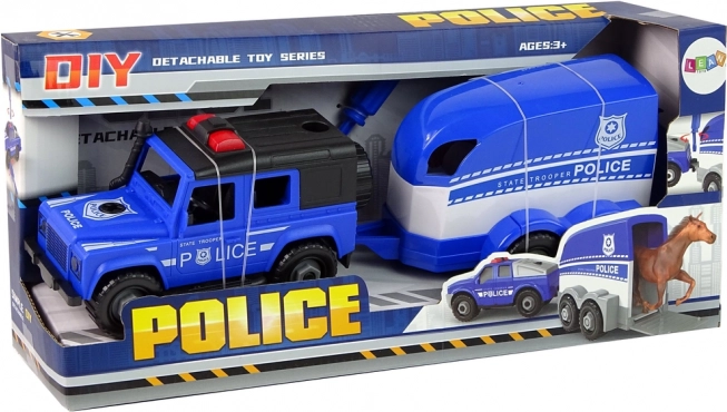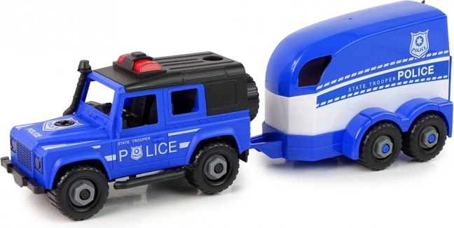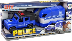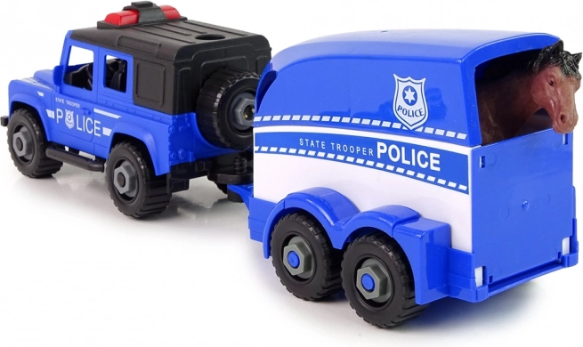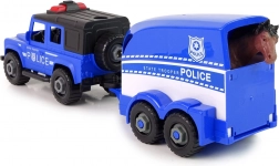 Zestaw idealny dla małych fanów policyjnych akcji. Samochód terenowy bezpiecznie holuje przyczepę dla konia, która ma otwieraną tylną klapę dla wygodnego załadunku i rozładunku. Dzięki śrubom i dołączonemu wkrętakowi pojazd można rozkręcać i składać, co rozwija umiejętności i uczy myślenia technicznego w atrakcyjny sposób.