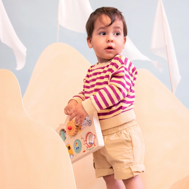 Przedstawiamy interaktywny drewniany panel w formie walizeczki, zawierający ulubione postaci Lilliputiens. Ten panel został zaprojektowany tak, aby twoje dziecko mogło obracać, naciskać, ciągnąć, potrząsać i obserwować różnorodne aktywności wspierające rozwój zdolności poznawczych.