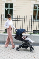 Czy łatwo się składa? Uwierz, to kwestia Twojej wygody. MoMi ESTELLE można złożyć w mgnieniu oka, a do tego ma genialne rozwiązanie – teleskopową rączkę do pchania lub ciągnięcia złożonego wózka!