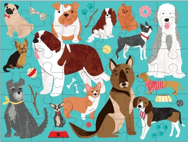 Odkryj świat psów dzięki puzzlom, które nie tylko bawią, ale też uczą. Puzzle przedstawiają mopsy, jamniki, bernardyny i innych uroczych psich przyjaciół. Woreczek wykonany jest w 100% z bawełny ze sznurkiem ściągającym, co czyni go idealnym towarzyszem w drodze. Ilustracje są autorstwa renomowanej twórczyni Liz Forester, co gwarantuje jakość i estetykę.
