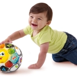 Dzięki swoim zdolnościom piłeczka potrafi toczyć się przed dziećmi, co przyciąga ich uwagę i motywuje do obserwacji, pełzania i zabawy. Ta kolorowa piłka o różnych fakturach i efektach dźwiękowych nie tylko rozwija zmysłową percepcję, ale także zapewnia dotykową stymulację dzięki delikatnej pluszowej powłoce. Efekty świetlne i dźwiękowe wzbogacone świecącym buziakiem i pomarańczowymi przyciskami pomagają w poznawaniu kolorów.