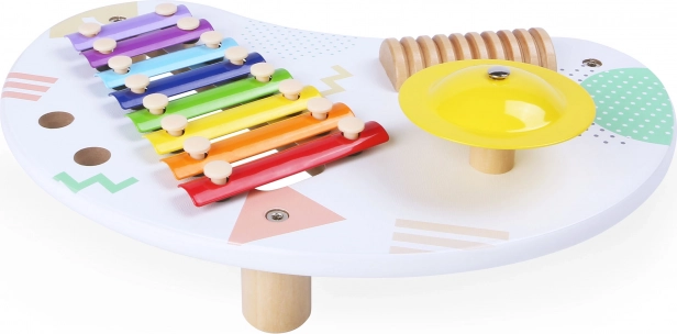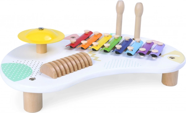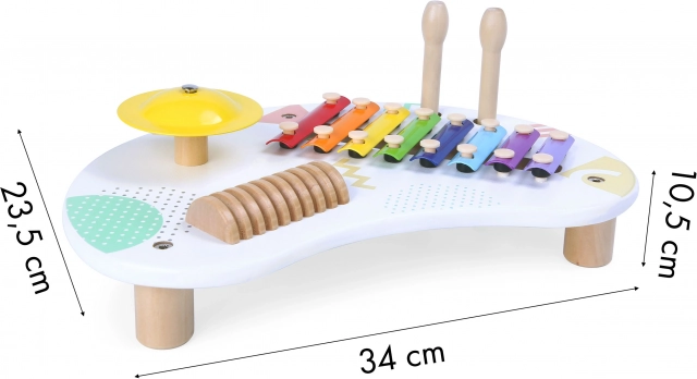 Stolik wykonano z wysokiej jakości drewna i metalu i wyposażono w bezpieczne, zaokrąglone krawędzie. Atrakcyjna kolorystyka wspiera percepcję wzrokową i motywuje do samodzielnej zabawy. Świetny jako pierwszy zestaw muzyczny, który wspiera percepcję słuchową, rytmikę i twórczość.