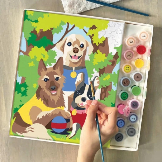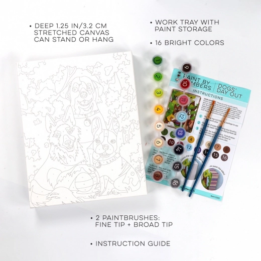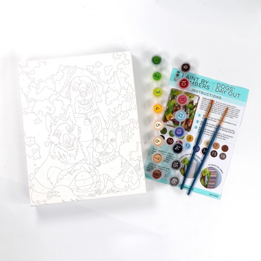 Ten zestaw malowania po numerach krok po kroku pomoże Ci stworzyć barwną scenę trzech psów na spacerze. Ponumerowane pola na płótnie odpowiadają numerom na kubeczkach z farbą, więc dokładnie wiesz, gdzie który odcień powinien trafić. Malowanie jest relaksujące, zabawne i odpowiednie dla początkujących oraz dzieci.
