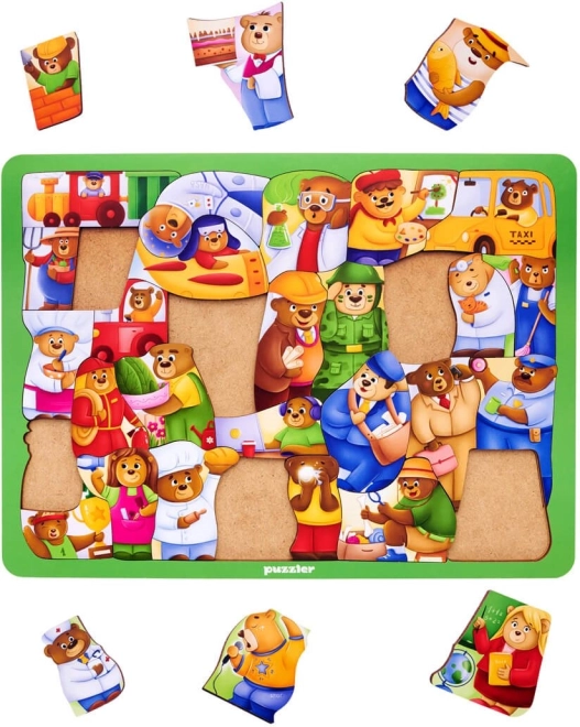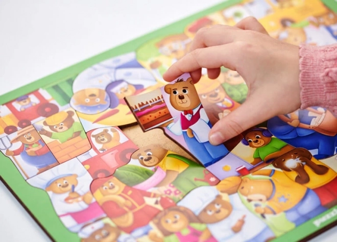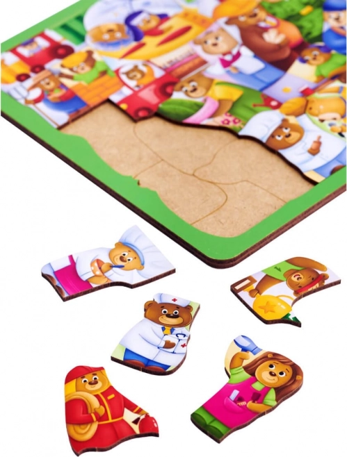 Odkryj świat pracy z uroczymi misiami i ciesz się kreatywną i edukacyjną zabawą dla dzieci. Drewniane puzzle o tematyce zawodów rozwijają małą motorykę, logiczne myślenie i zdolności poznawcze. Dzięki 30 elementom i wymiarom ok. 29 × 21 cm to idealna zabawka do nauki przez zabawę.