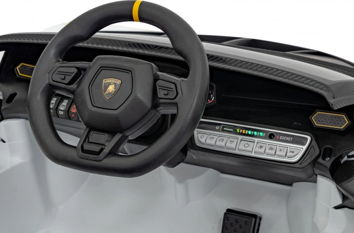 Stylowy dziecięcy elektryczny samochodzik inspirowany supersportem LAMBORGHINI oferuje 4×35 W silniki, baterię 12V/7Ah, otwierane drzwi oraz światła LED. Komfort zapewniają koła z pianki EVA i siedzisko z ekoskóry. Bezpieczną jazdę nadzoruje pilot 2,4 GHz z przyciskiem STOP i trzema prędkościami. O rozrywkę dba panel audio z MP3/USB/Bluetooth oraz wbudowane melodie.