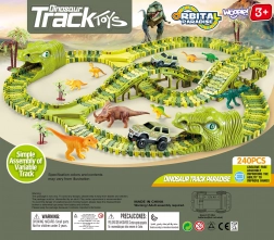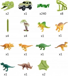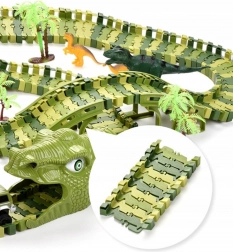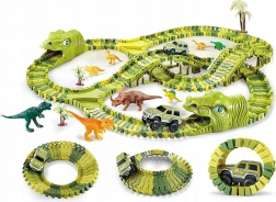 Zbuduj dzieciom świat pradawnych przygód. Zestaw zawiera wszystko do długiej i pomysłowej zabawy: modułowy zielony tor, 8 dinozaurów (w tym 2 duże), 2 tunele w kształcie głowy dinozaura, mosty, drzewka oraz elektryczne autko na baterię AA. Elementy łatwo zatrzaskują się ze sobą, tworząc pętlę, po której autko jedzie samo.