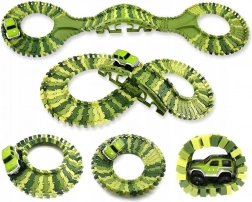 Maksymalne wymiary złożonego toru to ok. 80 × 85 × 8 cm, więc bez trudu zmieści się w pokoju dziecięcym. Zestaw rozwija twórczość, wyobraźnię przestrzenną i sprawność manualną – a jednocześnie zapewnia dynamiczną jazdę dzięki sprężystej nawierzchni toru z dobrą przyczepnością dla pojazdu.