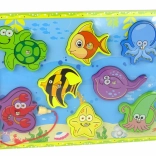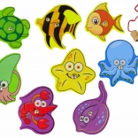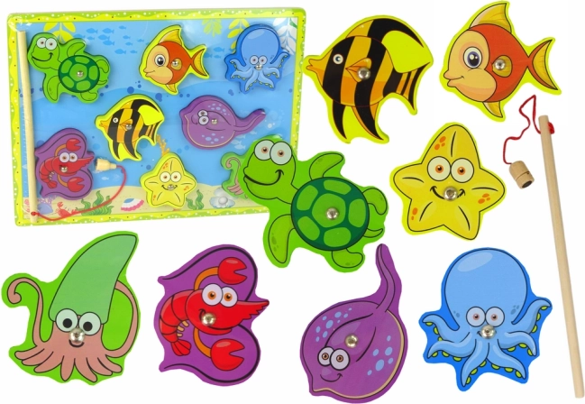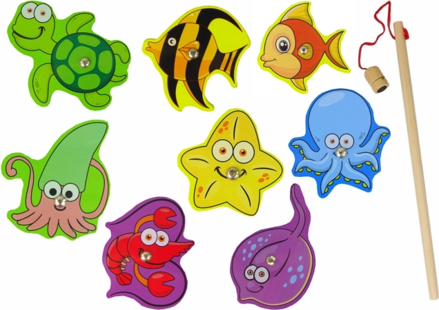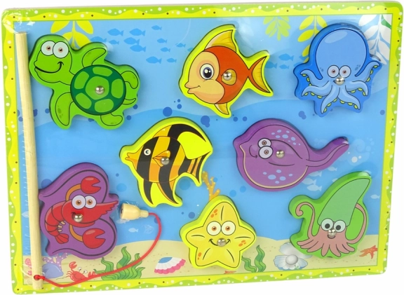 Drewniany zestaw do łowienia zwierząt morskich wyposażony jest w pięknie ilustrowaną planszę przedstawiającą dno morskie, która oferuje dzieciom fascynujący wgląd w podwodny świat. Różnorodne drewniane figurki zwierząt można w zabawny sposób rozkładać, a dzięki wbudowanym magnesom łowić za pomocą drewnianej wędki.