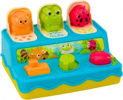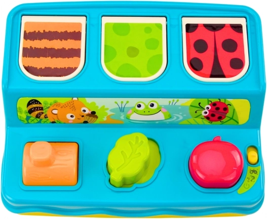 Zabawka składa się z solidnej, kolorowej podstawy, na której znajdują się różne kształty i przyciski. Każdy kształt przedstawia inne zwierzę, a przyciski służą do ich aktywacji. Gdy dziecko naciśnie lub poruszy określony kształt, wyskakuje jedno z trzech zwierzątek, co zachęca malucha do dalszego odkrywania.