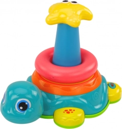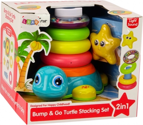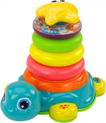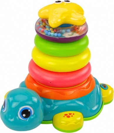 Piramida Jeżdżący Żółw 2w1 to dynamiczna zabawka łącząca zabawę z nauką. Podstawa w kształcie jeżdżącego żółwia reaguje na przeszkody i zapewnia efekty świetlne oraz dźwiękowe, dzięki czemu zabawa jest bardziej interaktywna.